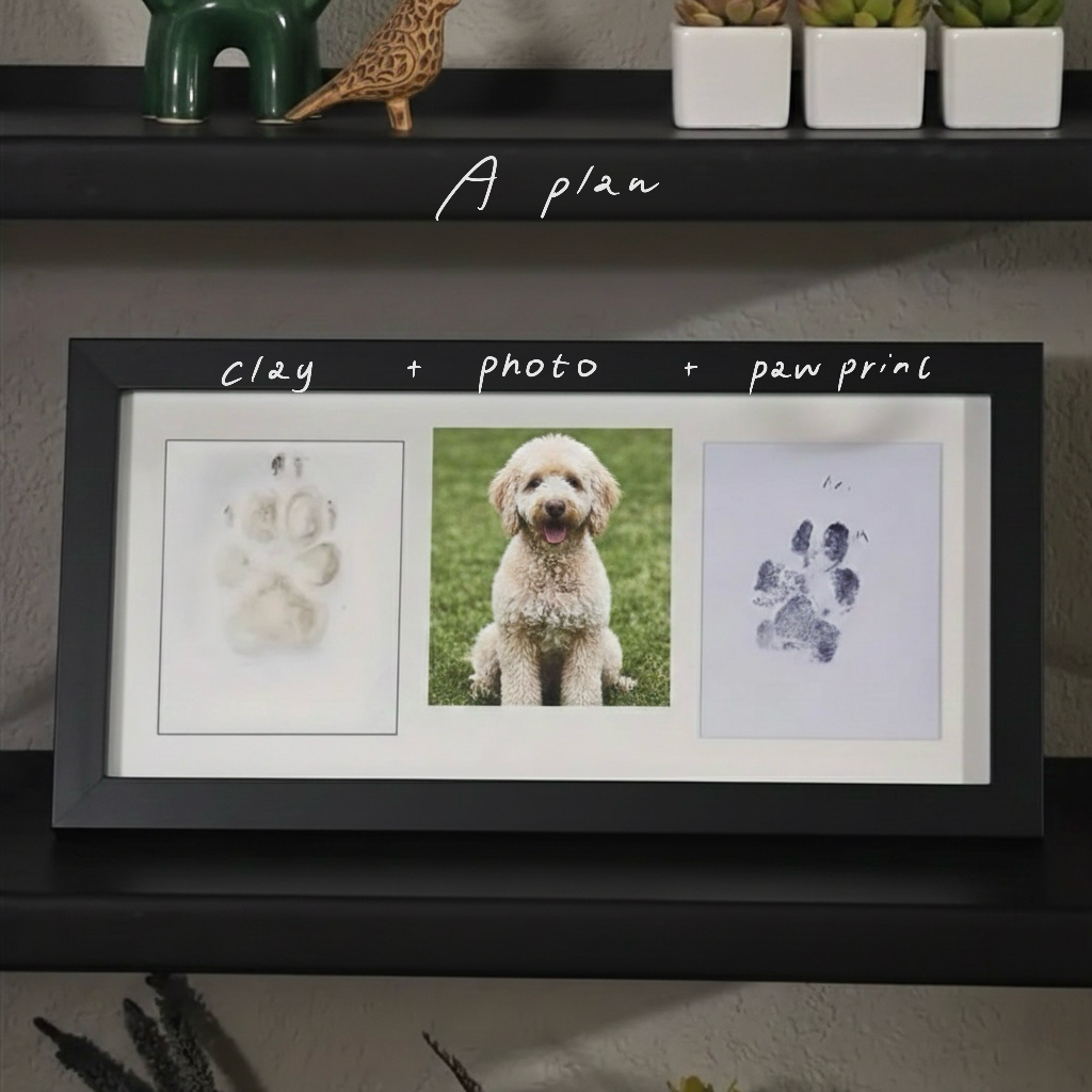 粘土の肉球型取り+お写真+インクプリント をひとつにまとめた、記念感たっぷりの仕上がりです。