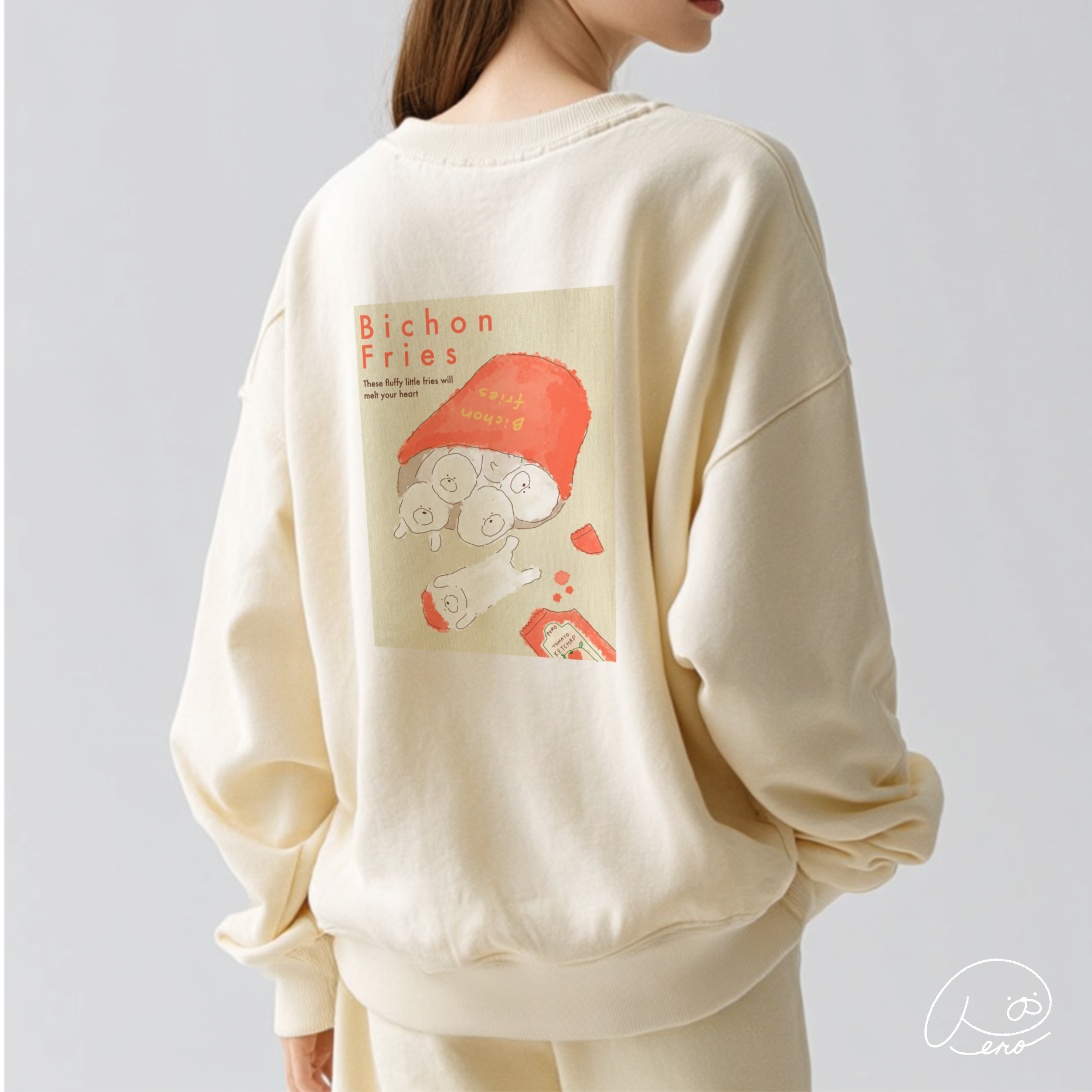 背面には「Bichon Fries」の楽しい文字と、まるでフライドポテトの容器から顔を出しているような愛らしいビション・フリーゼたちのイラストが描かれています。「These fluffy little fries will melt your heart(このふわふわの小さなフライたちが、あなたのハートを溶かします)」というキュートなメッセージ付き。前面には「obsessed with bichon」の上品な筆記体文字で、ビション愛を表現しています。
