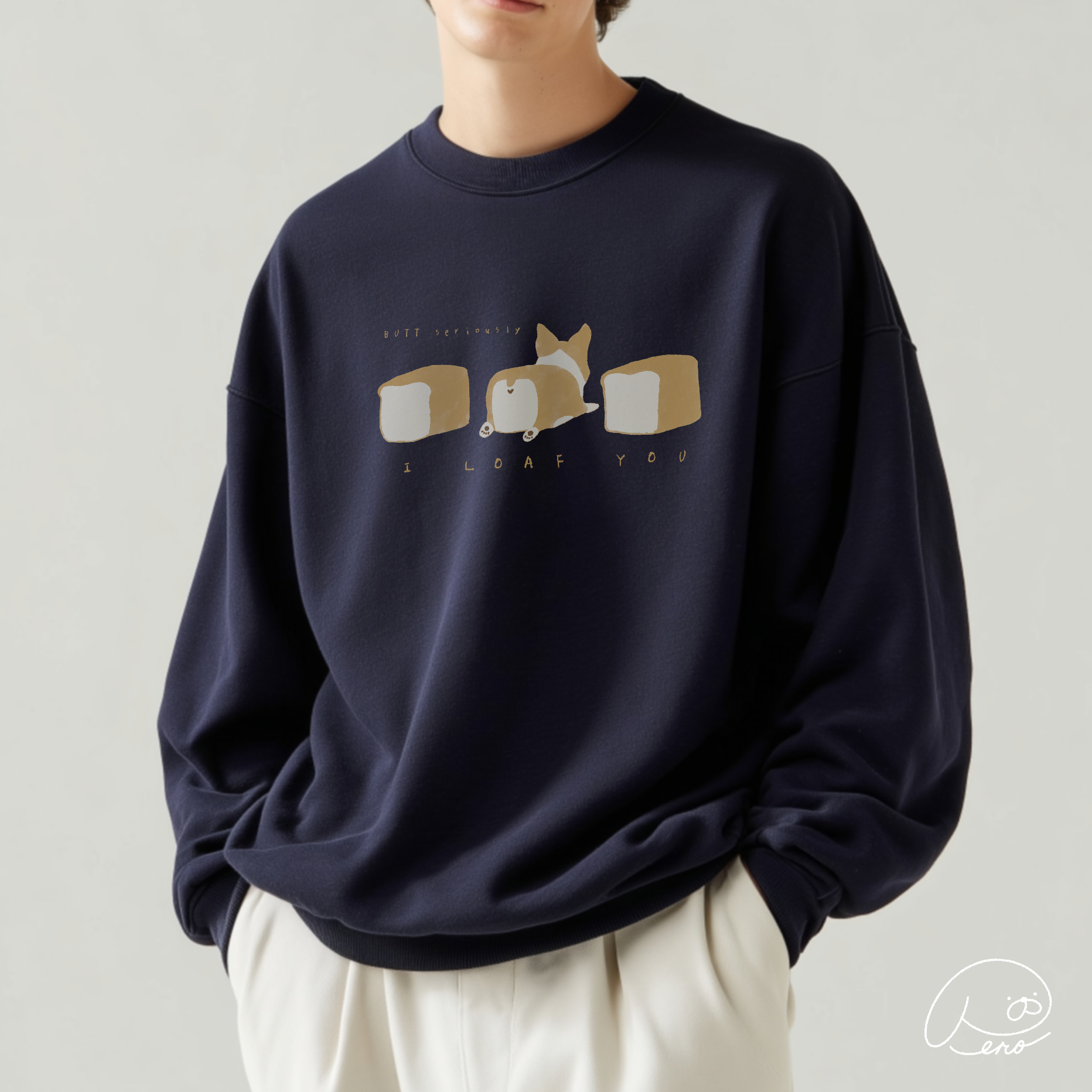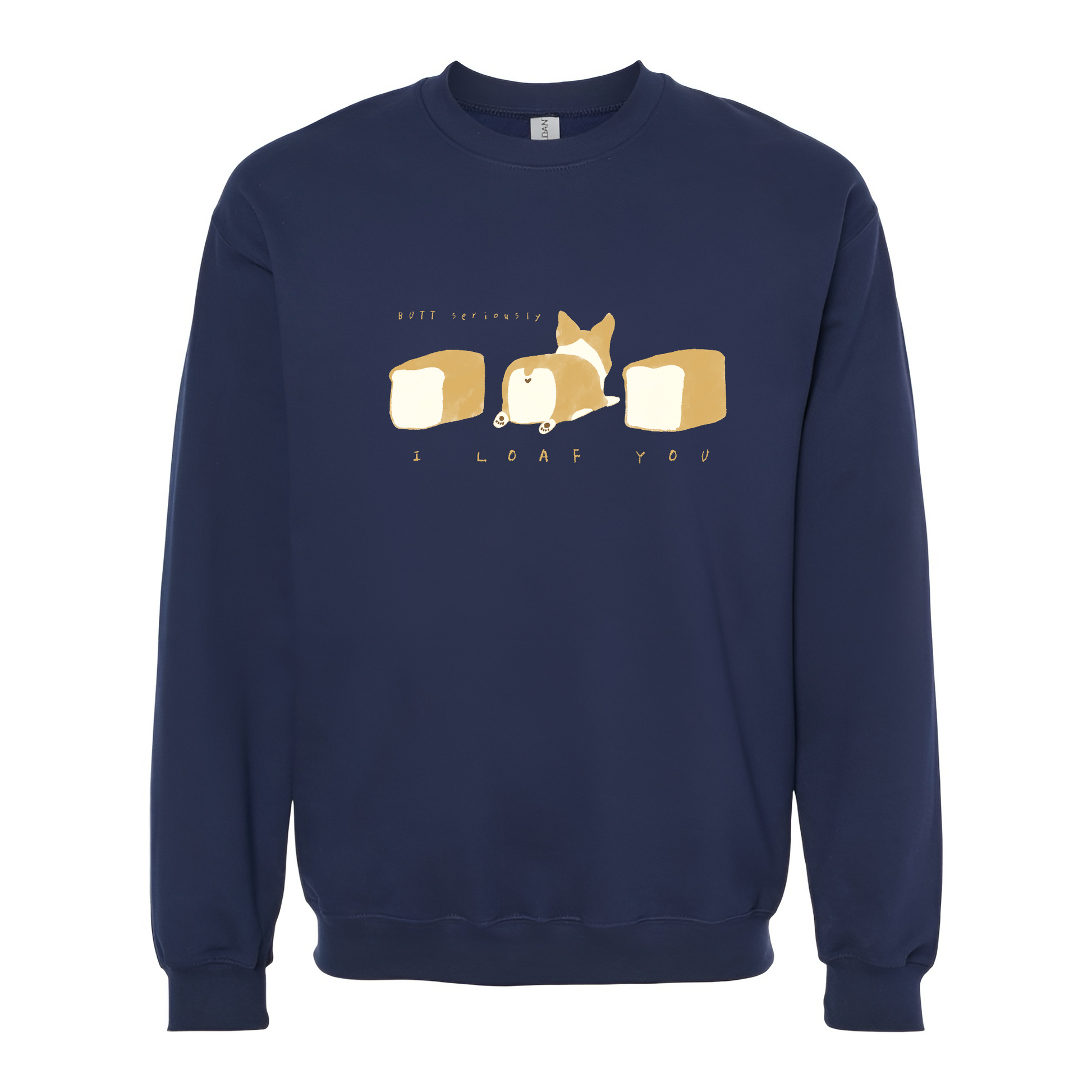 食パンの形をした愛らしいコーギーが「I LOAF YOU」のメッセージを届けてくれる、とってもキュートで心温まるトレーナーです。「I LOVE YOU」と「LOAF(食パン)」の絶妙な言葉遊びが、見る人を思わずほっこりと笑顔にさせてくれます。真ん中のコーギーちゃんがまるで本物の食パンのように愛らしく、パン好きにも犬好きにもたまらないデザインです。
