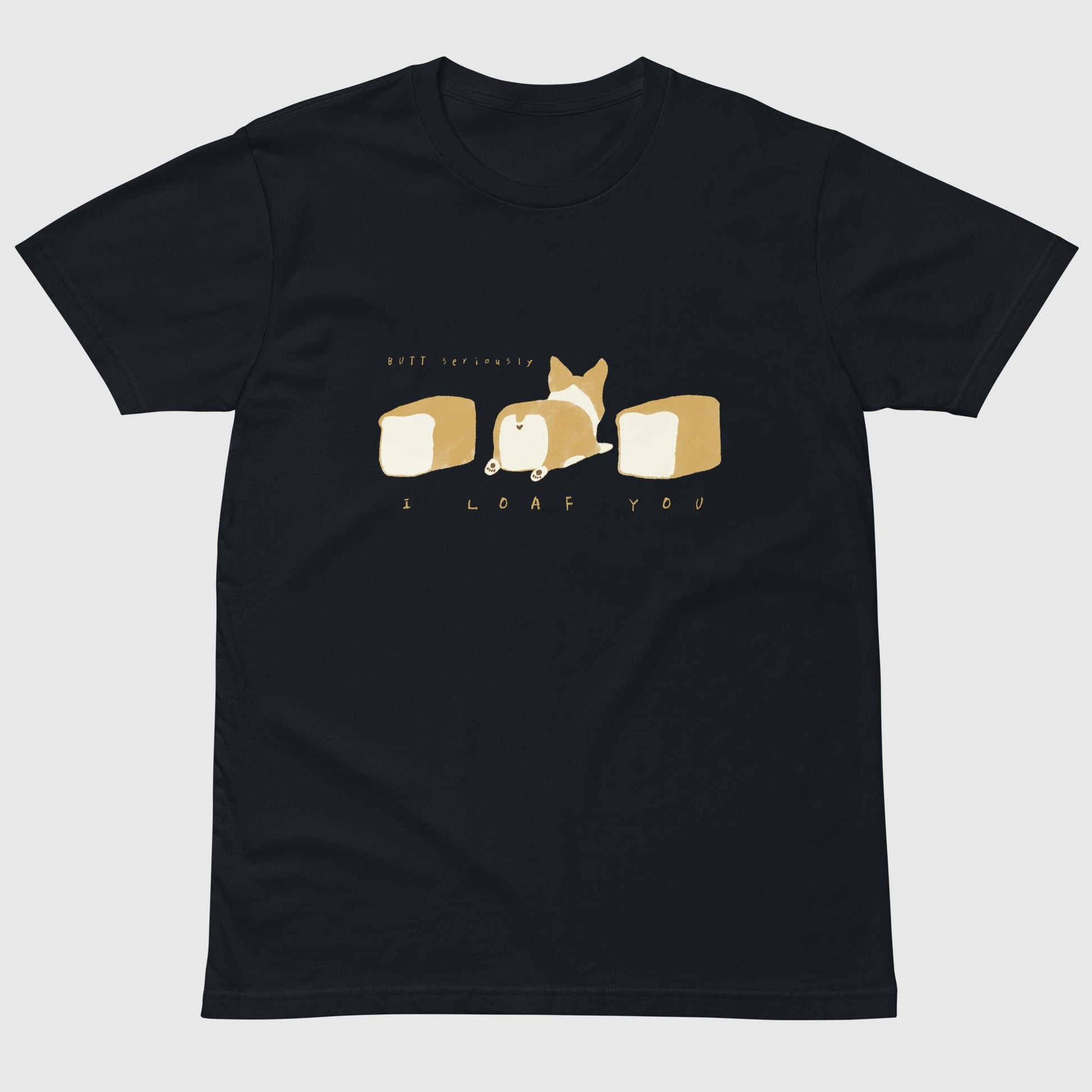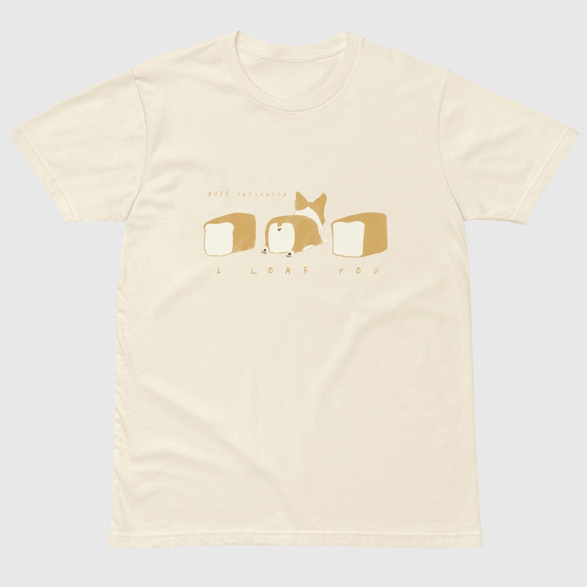 食パンの形をした愛らしいコーギーが「I LOAF YOU」のメッセージを届けてくれる、とってもキュートで心温まるTシャツです。「I LOVE YOU」と「LOAF(食パン)」の絶妙な言葉遊びが、見る人を思わずほっこりと笑顔にさせてくれます。真ん中のコーギーちゃんがまるで本物の食パンのように愛らしく、パン好きにも犬好きにもたまらないデザインです。