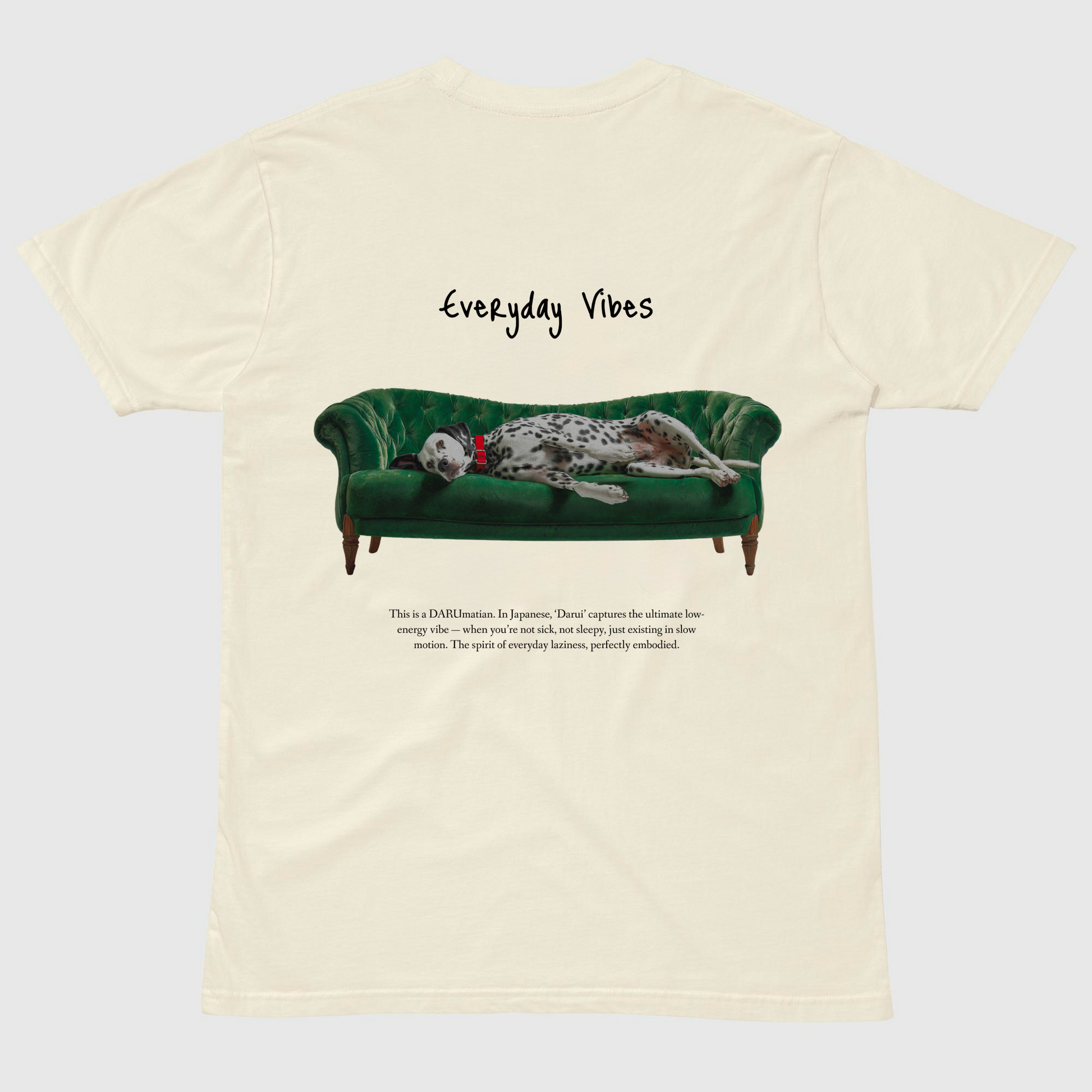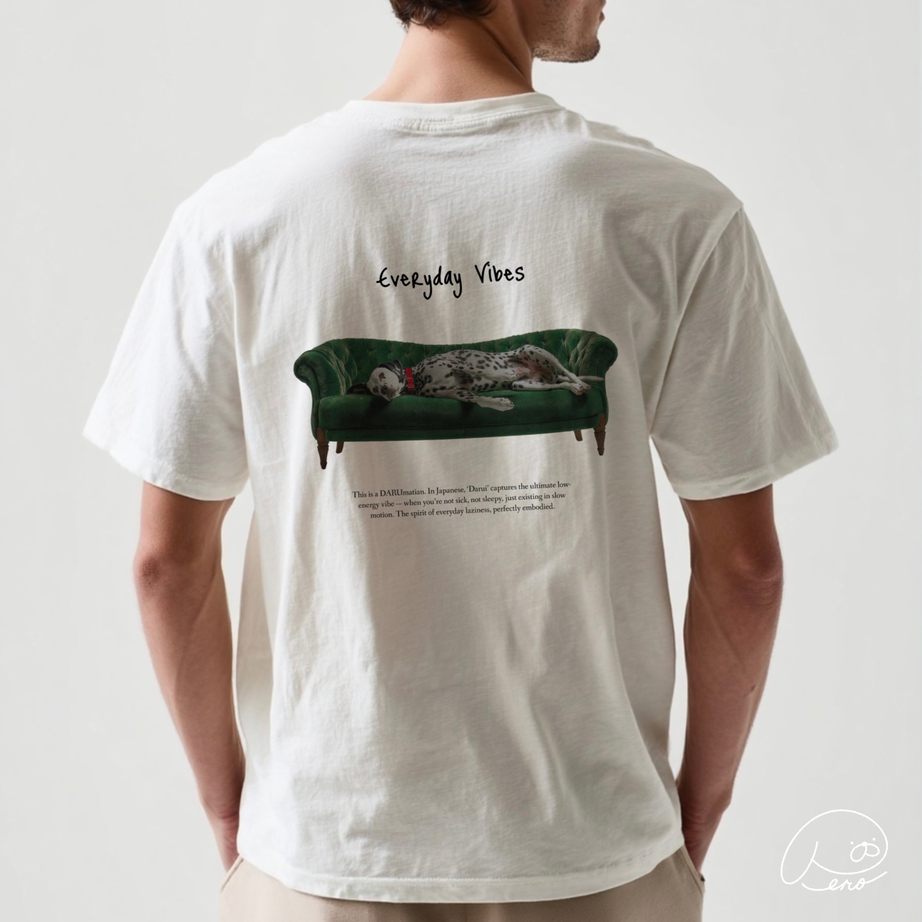 背面には、気怠げにくつろぐダルメシアンと「Everyday Vibes」のメッセージ。