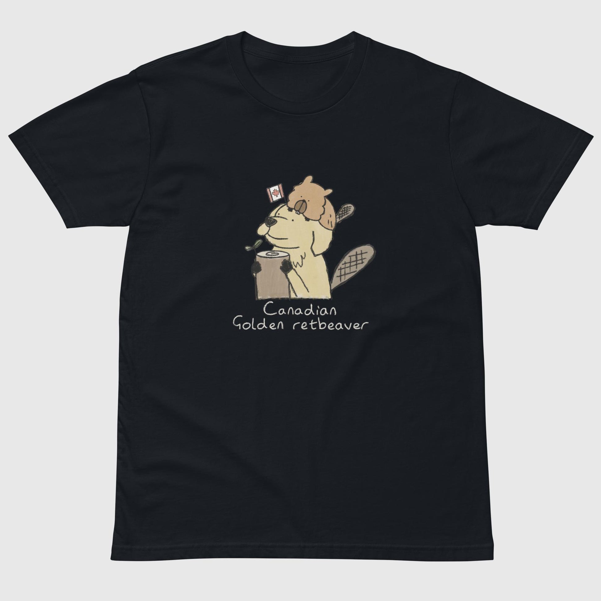 ゴールデンレトリバーとカナダの象徴ビーバーが融合した、とってもユニークで愛らしいTシャツです。「Golden Retriever」と「Beaver(ビーバー)」を組み合わせた「Golden Retbeaver」の絶妙な言葉遊びが、見る人を思わずクスッと笑顔にさせてくれます。小さなカナダ国旗を持ち、ビーバーの平たい尻尾を持つゴールデンレトリバーが、まるで本当にカナダに住んでいるかのような愛らしさです。