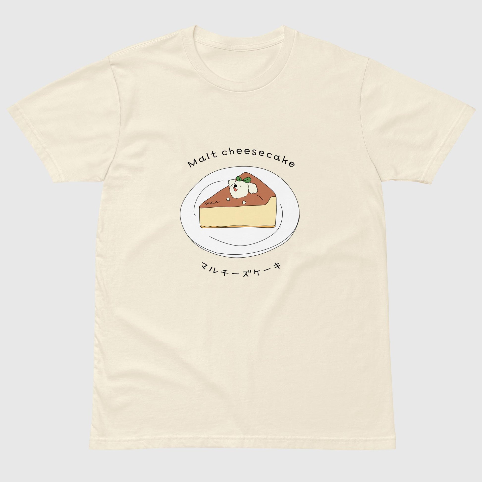 チーズケーキの上に愛らしいマルチーズの顔がちょこんと乗った、とってもキュートで美味しそうなTシャツです。「Malt cheesecake(マルトチーズケーキ)」と「マルチーズケーキ」の絶妙な言葉遊びが、見る人を思わずクスッと笑顔にさせてくれます。お皿の上の真っ白なチーズケーキと真っ白なマルチーズが完璧にマッチした、甘い幸せを運んでくれるデザインです。